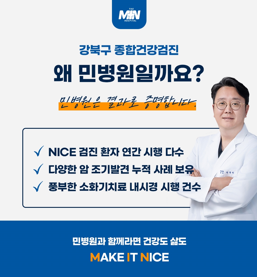 민병원의 NICE 종합검진은 숙련된 노하우와 신속함을 바탕으로 질 높은 관리를 지향합니다. 대학병원 암센터 출신의 의료진이 각 분야별로 직접 진단을 시행하여 신뢰도를 높였으며, 5대 암 검사가 가능한 국가 지정 의료기관으로서 풍부한 경험을 보유하고 있습니다. 특히 진단부터 이후 과정까지 원활하게 연결되는 시스템을 구축하여 유소견자의 조직검사와 내시경 조치를 신속하게 시행함으로써 골든타임을 지키고자 노력합니다. 아울러 첨단 장비를 활용하면서도 합리적인 비용을 유지하며, 개개인의 요인을 고려한 맞춤형 프로그램을 통해 적절한 건강 상태를 유지할 수 있도록 돕고 있습니다.